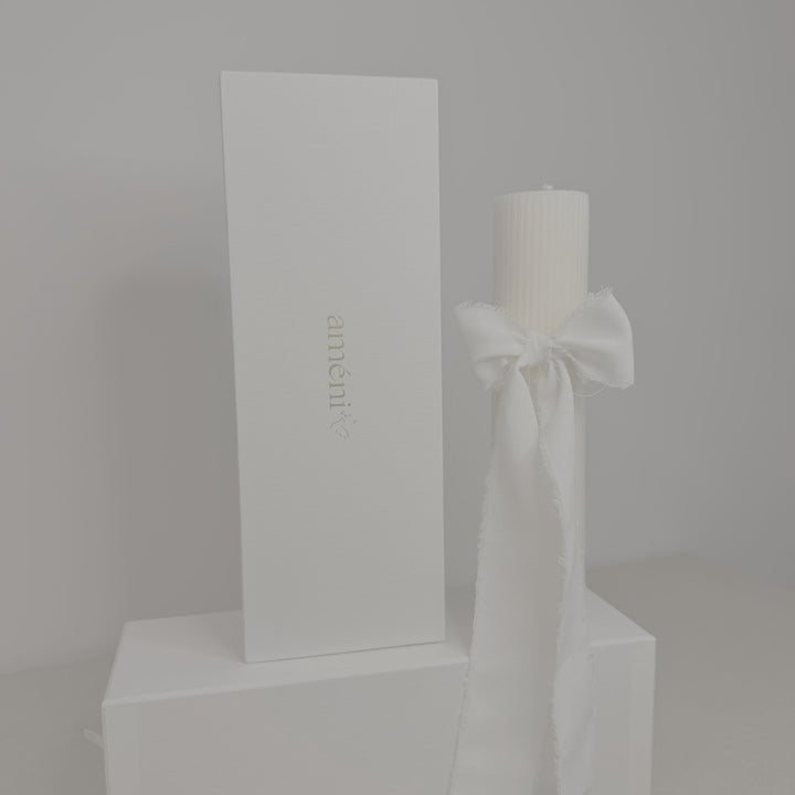 Svijeća je ukrašena bijelom mašnom, dok joj rebrasta tekstura dodaje dašak elegancije i minimalizma. Dolazi pažljivo pohranjena u posebno dizajniranu kutiju Ameni-a, osmišljenu u duhu jednostavnosti i čistoće linija.